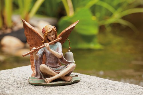 Inspired by garden ponds and imagining the whimsical secret life of playful creatures, this piece evokes the idea of the grand symphony put on each night by Mother Nature. Carved in rich detail, this musical fairy looks great in the garden or gracing a child's bedroom. A garden bell accents the beautiful sculpture, as the Fairy with Flute Garden Statuary plays on day after day, bringing a smile to the face of all who discover her.