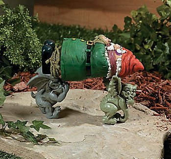 Relaxing gnome, taking a little breather has been kidnapped or is that G'napped by a pair of naughty gargoyles. Great fun addition to your garden