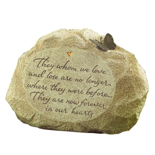 7 of 7 people found the following review helpful By Roberto A. Villarreal (San Antonio, TX) - See all my reviews Amazon Verified Purchase This review is from: Grasslands Road Always in Our Hearts Bereavement Stone "They Whom We Love" (Lawn & Patio) I purchased this item to place outside in a garden that my wife and I have dedicated to our first born son, who passed away at around 4 months old.** BUILD QUALITY ** ------------------- This stone is made of the same cement resin that many decoration of this style are made of. Because of that, it is relatively heavy for an object of it's size but it also feels very sturdy and very well made. The rock detailing on the surface of the stone is very high quality and you might think you were looking at a polished/smoothed stone if you didn't know any better. The butterfly itself also has detailing in the wings. The butterfly is made of very thin pieces of metal that are about half as thick as a penny. The butterfly does feel a little flimsy, but so long as you are not tugging on it or constantly messing with it, it seems like it will stay in place very well. ** OTHER DETAILS ** ------------------- The bottom of the stone is not detailed like the... Read more 1 of 1 people found the following review helpful By Amazon Verified Purchase This review is from: Grasslands Road Always in Our Hearts Bereavement Stone "They Whom We Love" (Lawn & Patio) The item arrived in good time and looks really nice. The only problem is that the metal butterfly is not stainless steel and is therefore beginning to rust, which is therefore starting to stain the stone around it. For an outdoor stone, the butterfly should have been made out of weather-proof material. By mumzonline (United States) - See all my reviews Amazon Verified Purchase This review is from: Grasslands Road Always in Our Hearts Bereavement Stone "They Whom We Love" (Lawn & Patio) Upon opening the box I was conflicted between feeling annoyed at it taking nearly 4 weeks to arrive, and whether I still liked it. I will keep it because the words are meaningful to me and I have grown to like it. It is lightweight resin with sandstone coloring. |